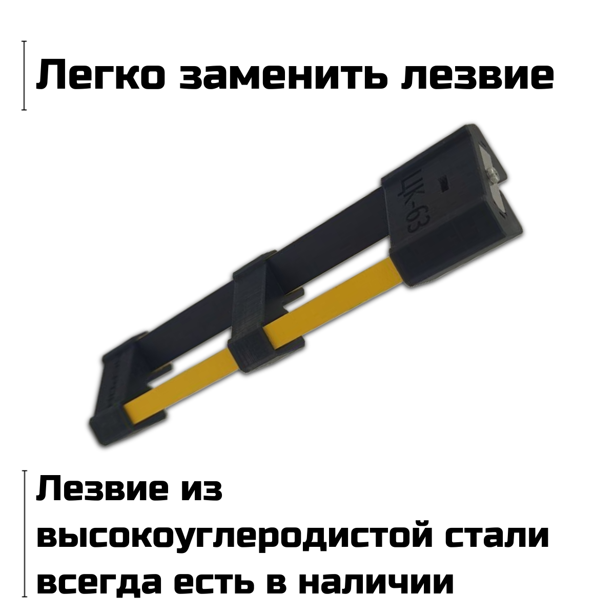 ЦК-63 - это идеальный инструмент для аккуратного и точного съема фаски на кромке толщиной 0.4 мм. (перед снятием фаски, выступающие излишки кромки нужно срезать ножом. ЦК-63 - это НЕ подрезатель кромки, данный инструмент используется для убирания острых краёв на подрезанной кромке). Благодаря эргономичной форме, она удобно лежит в руке, обеспечивая комфорт даже при длительной работе. Оснащена механизмом смены лезвий, что позволяет легко поддерживать инструмент в рабочем состоянии. (лезвия всегда есть в наличии в нашем магазине) Незаменима, когда требуется чистая и ровная фаска на кромке ЛДСП.
