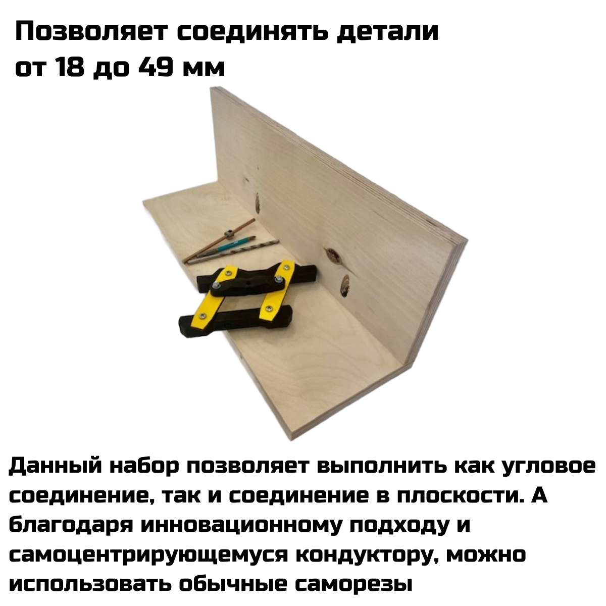 Данный набор позволяет выполнить как угловое соединение, так и соединение в плоскости. А благодаря инновационному подходу и самоцентрирующемуся кондуктору, можно использовать обычные саморезы.