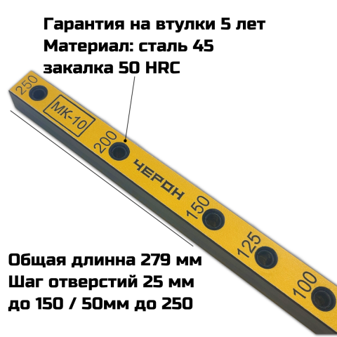 - Мебельный кондуктор укороченный МК-10 предназначен для сверления отверстий 5 мм в торце плиты 16 мм с шагом отверстий 25/50 мм. (можно сверлить плиты и другой толщины с использованием переходников)