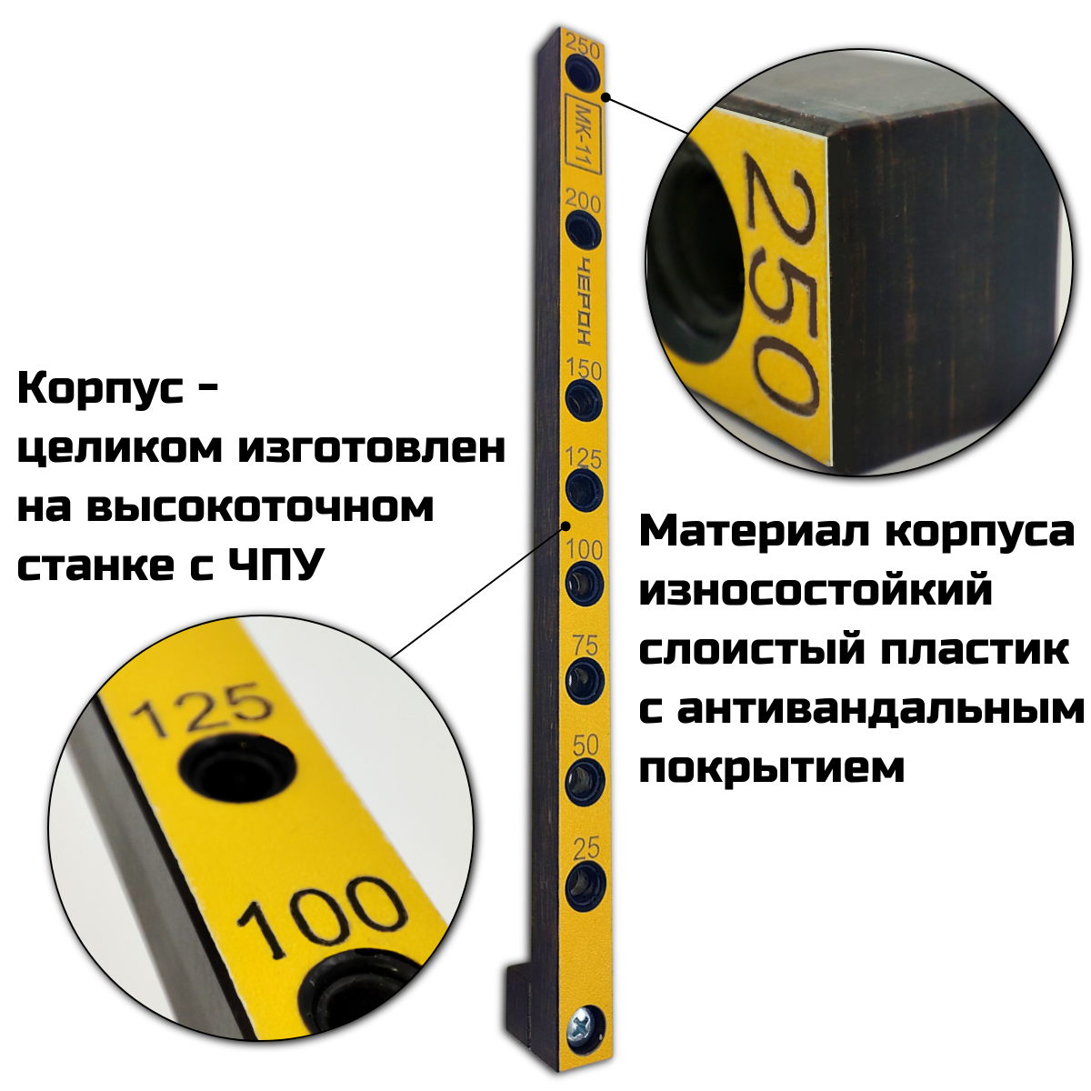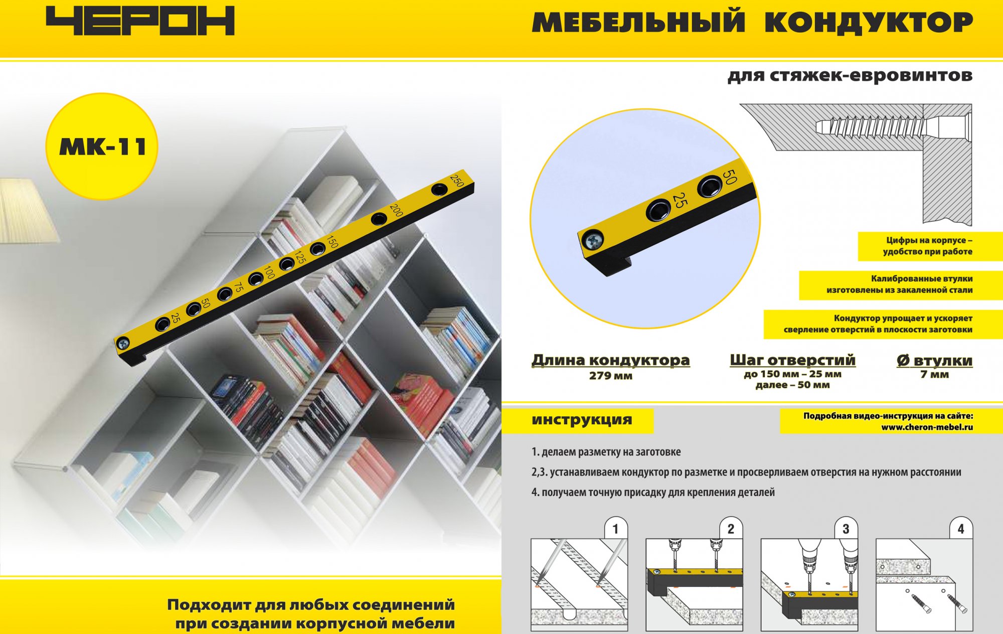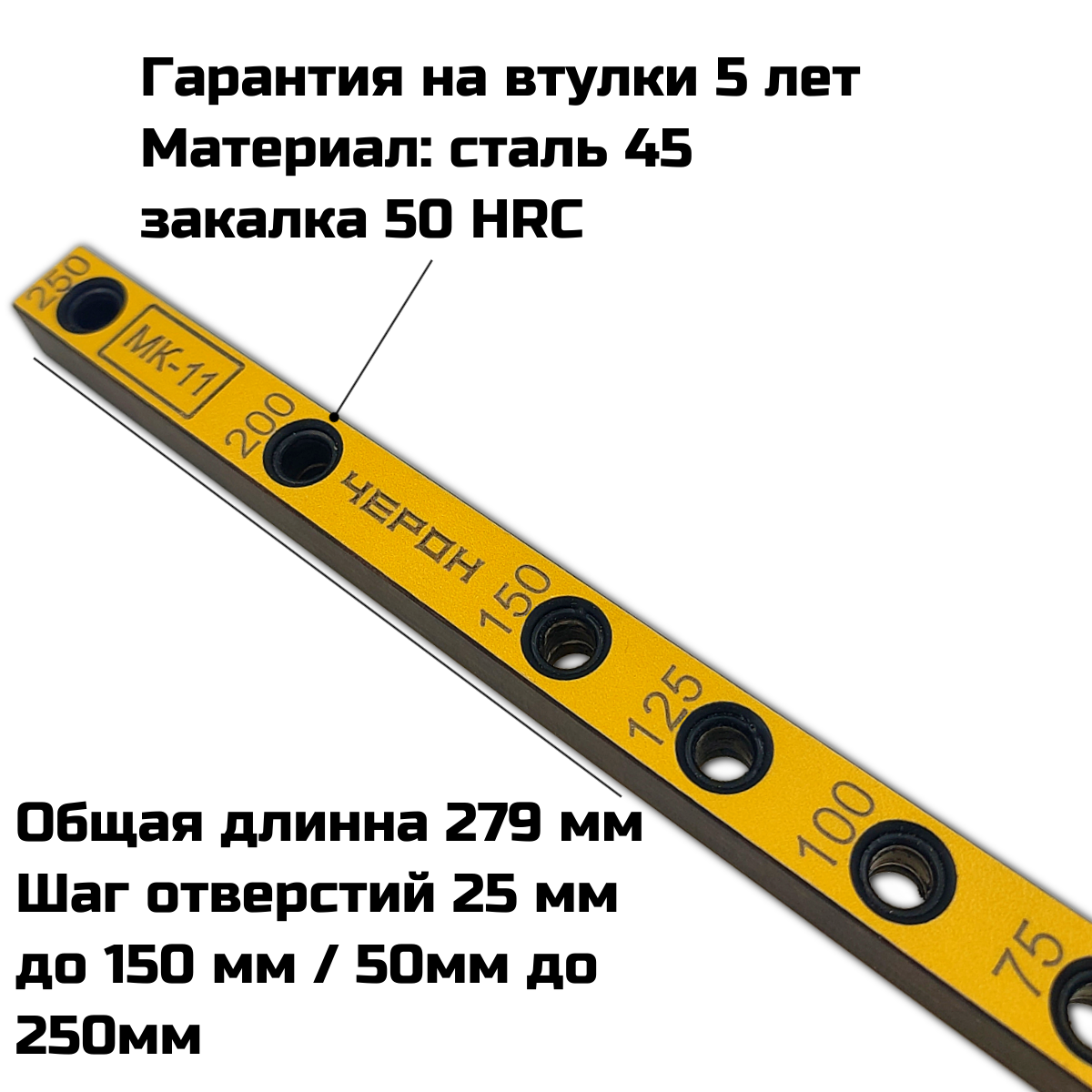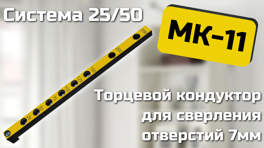- Мебельный кондуктор укороченный МК-11 предназначен для сверления отверстий 7 мм в торце плиты 16 мм с шагом отверстий 25/50 мм. (можно сверлить плиты и другой толщины с использованием переходников)