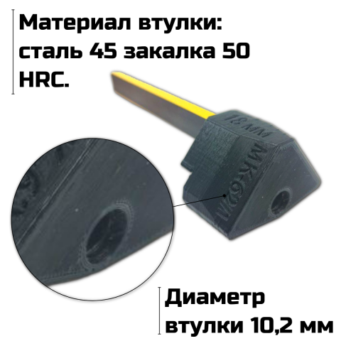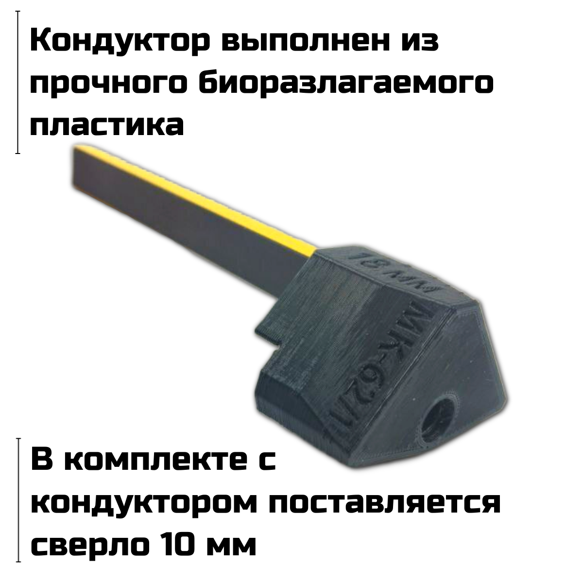 Кондуктор оснащен закаленной втулкой диаметром 10 мм., что обеспечивает надежность и долговечность инструмента, позволяя ему выдерживать многократные циклы сверления без потери точности. Основной корпус выполнен из биоразлагаемого пластика, что делает инструмент прочным и экологически безопасным.