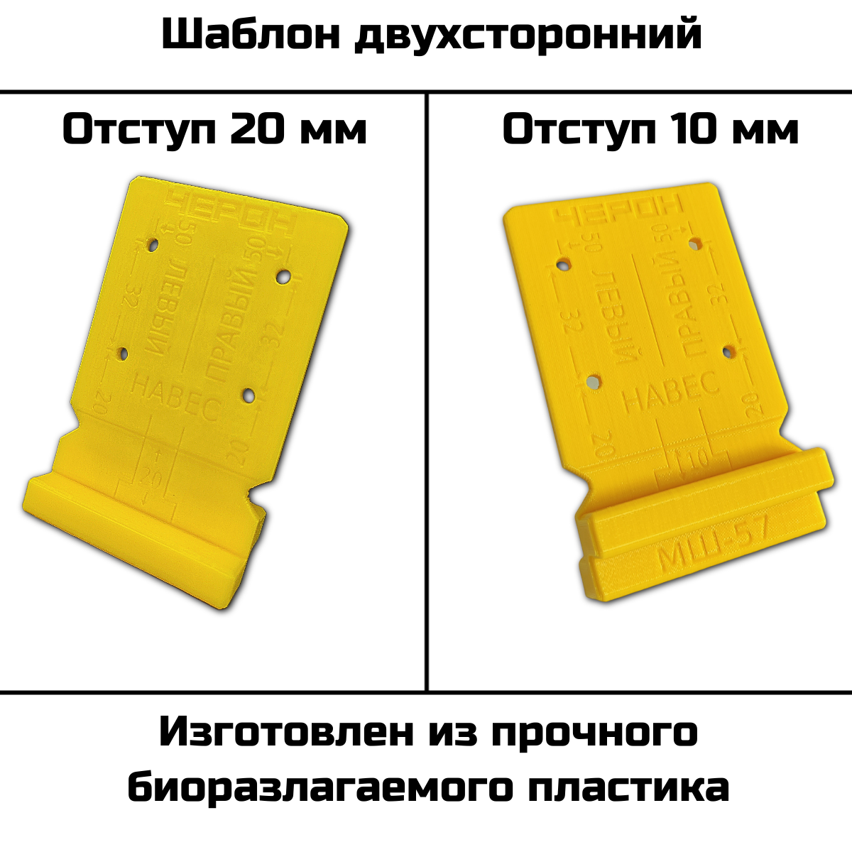 1) Приложите шаблон к краю задней стенки собранного короба, уперев к верхней крышке. Шаблон имеет 2 упорные планки,1-я для установки навеса заподлицо, 2-я для установки с отступом 10мм