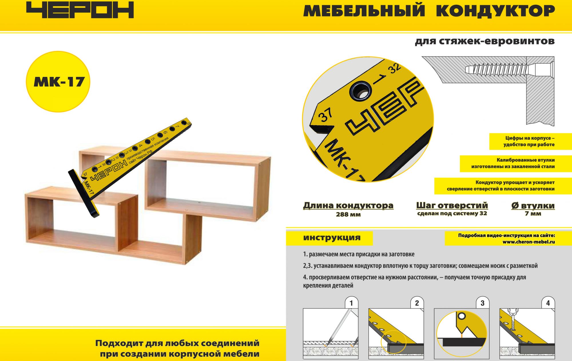 2. МК-17 Мебельный кондуктор "угольник малый" система "32" диаметр втулки 7 мм. Мебельный кондуктор угольник укороченный МК-17 предназначен для сверления отверстий 7 мм. в плоскость плиты 16 мм. с шагом отверстий 32 мм. (можно сверлить плиты и другой толщины с использованием переходников)