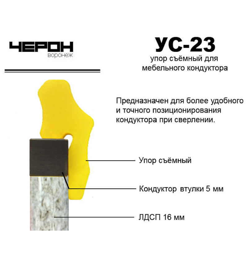 7. УС-23 Упор для кондуктора втулки 5 мм. (для плиты 16 мм.). Этот упор предназначен для стабилизации кондуктора с втулкой диаметром 5 мм. при установке в плиты толщиной 16 мм. Он облегчает процесс установки и обеспечивает точность позиционирования.