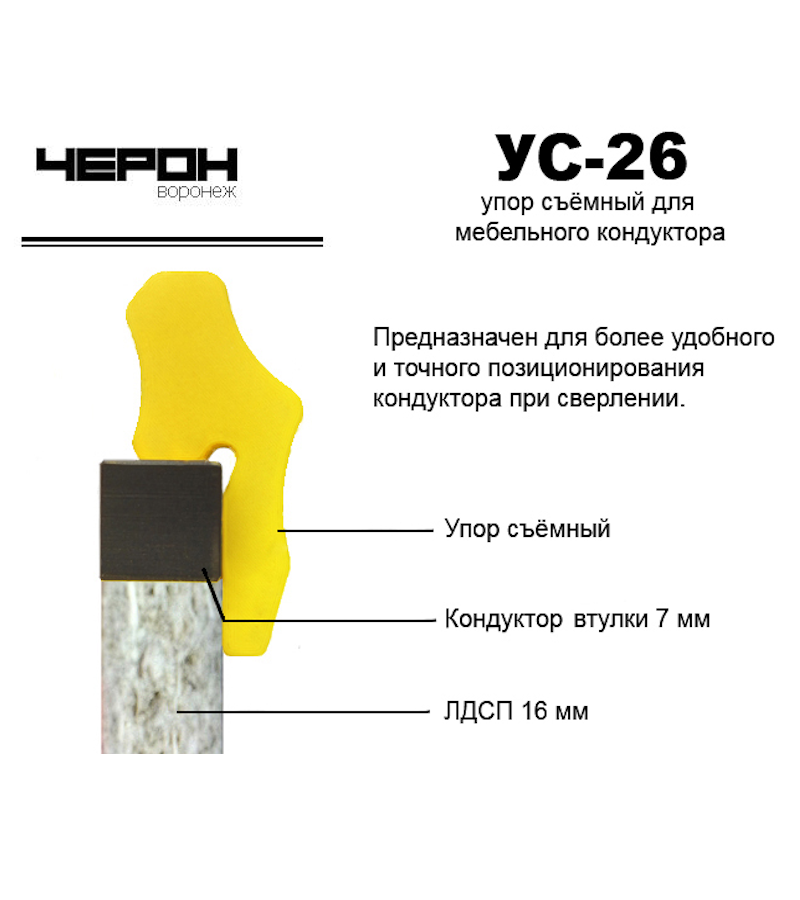 8. УС-26 Упор для кондуктора втулки 7 мм. (для плиты 16 мм.). Данный упор предназначен для стабилизации кондуктора с втулкой диаметром 7 мм. при установке в плиты толщиной 16 мм. Он обеспечивает точность позиционирования и надежное крепление кондуктора.