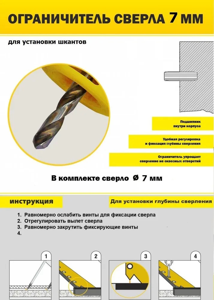 - Позволяет быстро изменять отступ без снятия ограничителя со сверла