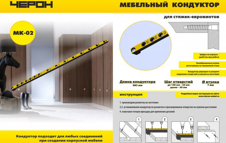 - Черон МК-02 — удлиненный прямой мебельный кондуктор для присадки в торец